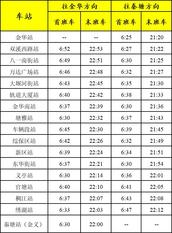 4月17日起,金华轨道交通将实行新版G01010列车运行图,全线运营时间延长20分钟,运营服务时间增加至16.6小时。金华站末班车时间由21:00延至21:20,秦塘站末班车时间由21:40延至22:00。