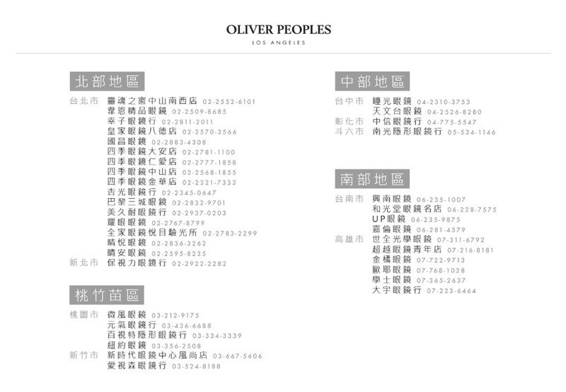 RORKE_建议售价$14,800 Oliver Peoples 于2020年由全球时尚精品业龙头集团Luxottica台湾分公司接手直营业务,除了提供完整行销与售后服务外,更在今年举办直营三周年纪念暨 2023年春夏新品上市记者会。除了展示满满惊喜的Oliver Peoples时尚潮流设计新款系列,特地在台北超级热门的打卡据点---最具美式顶级浪漫生活感的CHALET V,打造了一场呼应好莱坞片场的记者会,邀请了台湾最有星级魅力的艺人与多位时尚KOL出席共襄盛举,一起与Oliver Peoples 大开眼界,一秒马上成为夏日亮点。2023年春夏新品目前已于全球亮眼上巿,并于以下店点同步贩售。