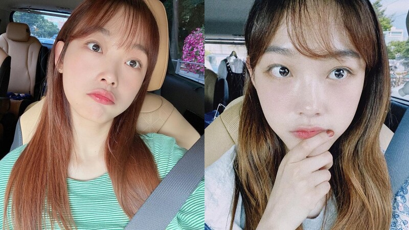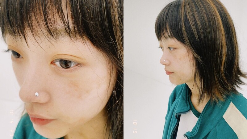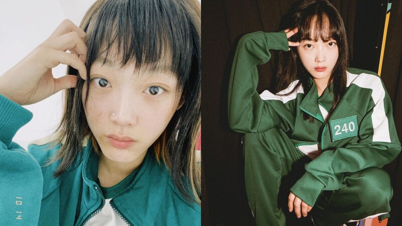 李瑜美《鱿鱼游戏》造型,右边则为下戏后再度穿上戏中制服。 智英挑染不羁短髮