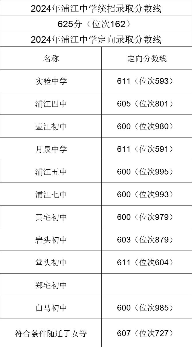 3、汤溪高级中学:606分(面向市区录取计划650人,实际录取650人,统招录取的最后一位考生成绩:语文104、数学106、英语115、科学148、社会93、体育40)。