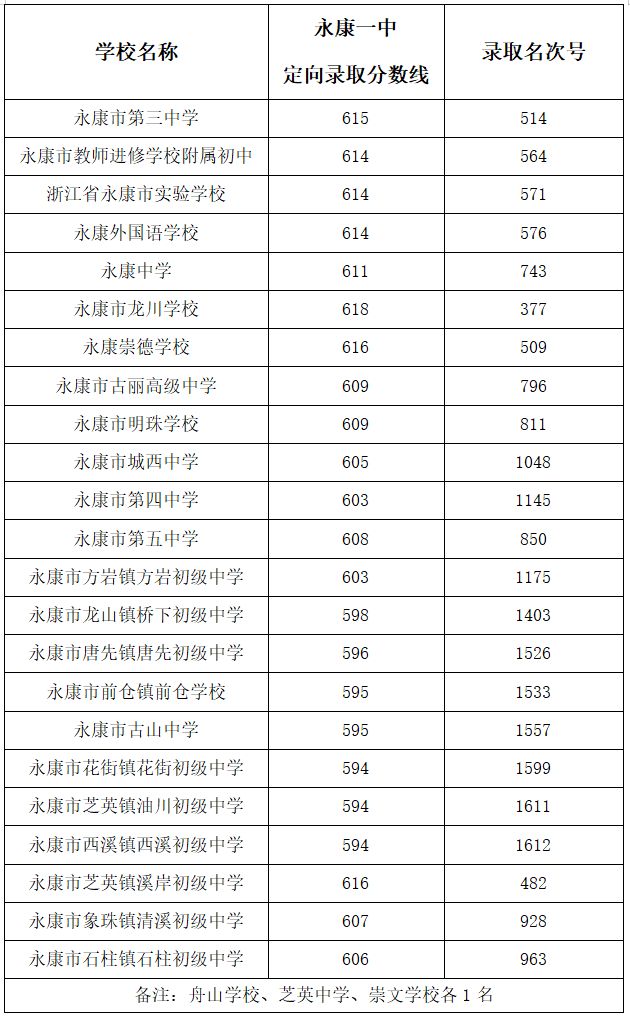 在综合录取之后,按永康一中招生计划数最后一名考生学业水平考试成绩总分划定城区学校定向分配生录取最低控制分数线,农村学校在城区学校定向分配生最低录取控制分数线下15分划为农村学校定向分配生录取最低控制分数线。若在此范围内没有考生录取的农村初中学校,可在城区学校最低录取控制分数下30分内录取符合条件的考生1名(崇文学校1名)。此前若无录取考生的薄弱学校在城区初中定向分配生录取最低控制分数线下60分内从高分到低分录取符合条件的考生2名(舟山学校、芝英中学各1名)。