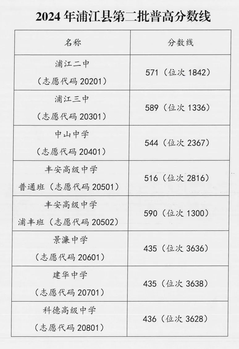 普通批实验中学、武阳中学、东皋中学、下杨中学、新纪元双语学校591分,最后一位录取考生位次号622;第五中学583分,最后一位录取考生位次号821;民族中学581分,最后一位录取考生位次号870;桃溪中学578分,最后一位录取考生位次号923。