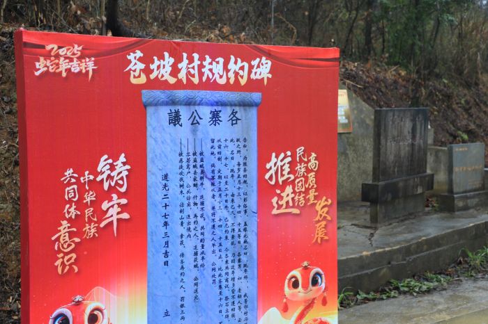 据了解,该活动持续两天,其中正月十三为“踩场”,正月十四为正场。苍坡村的跳场活动拥有悠久的历史,可追溯至道光年间。在苍坡村新寨大坡上,矗立着一块刻有跳场“规约碑”的石碑,已被列为区级保护文物。
